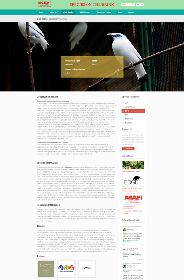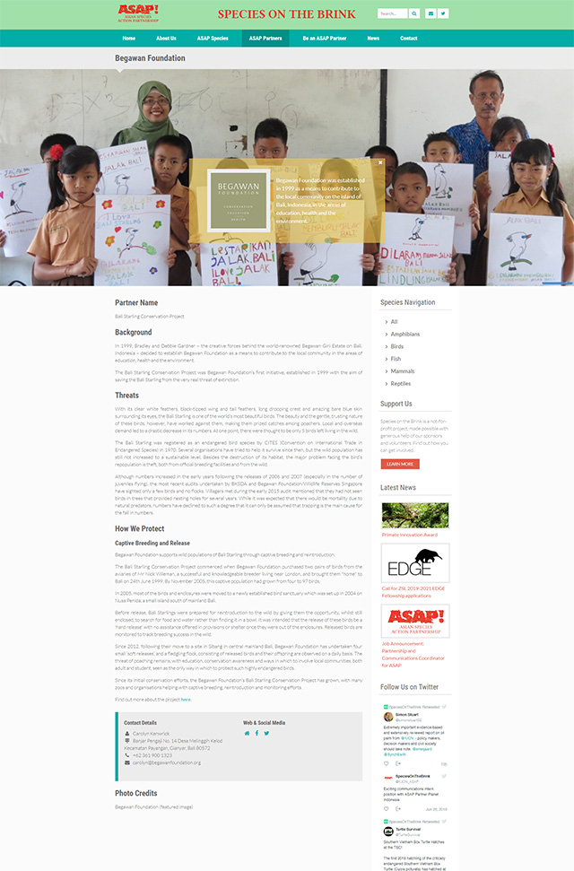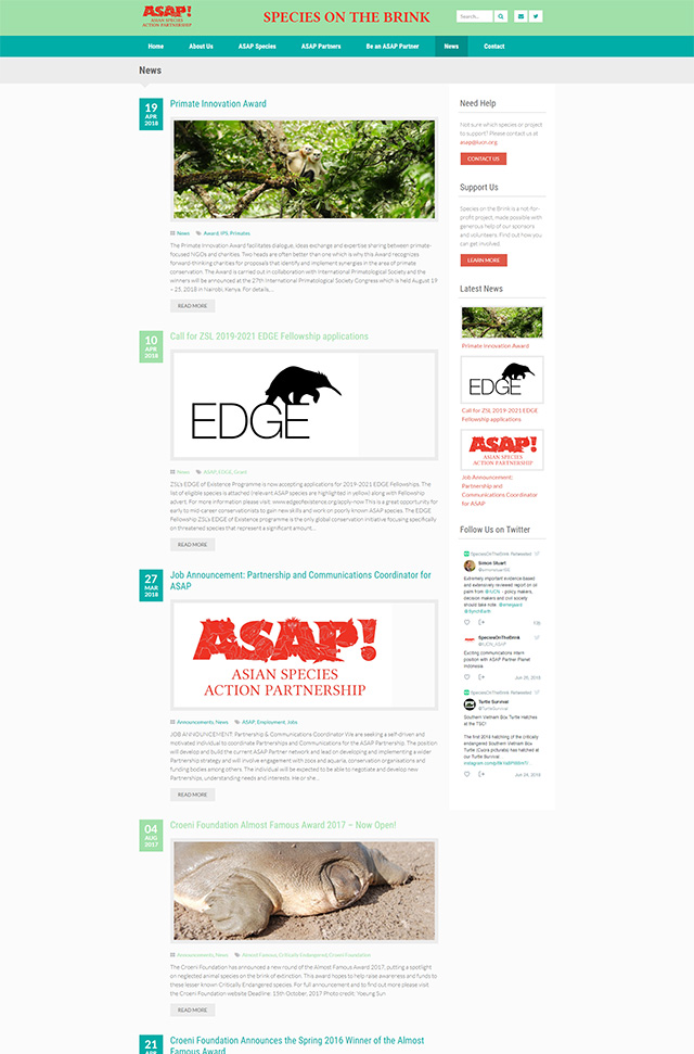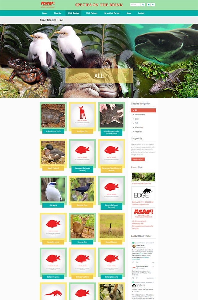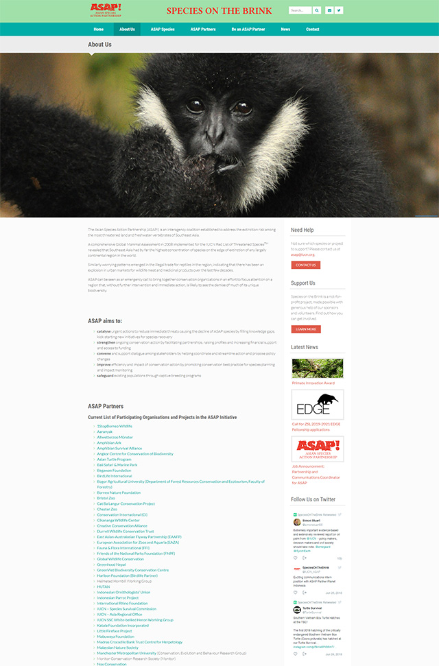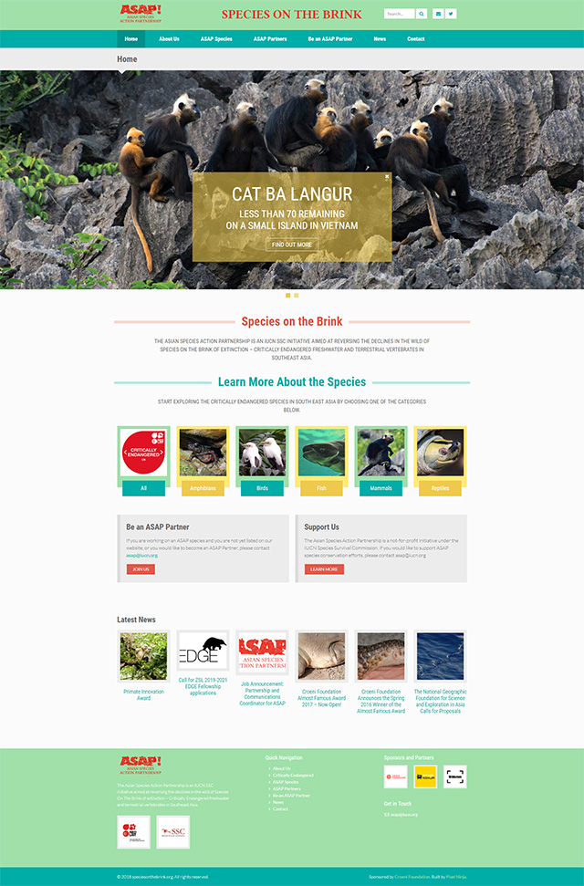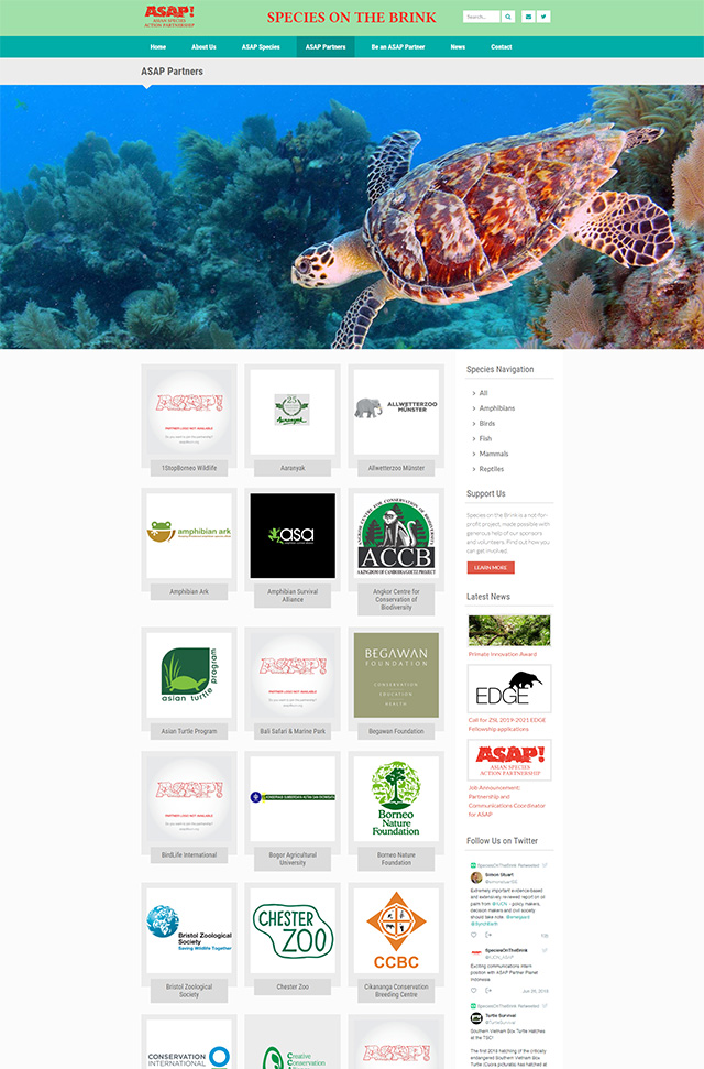 Designed and developed from the ground up, the Species on the Brink website is essentially a directory of the critically endangered animal species in Southeast Asia and the partner organizations working on their preservation. Its aim is to bring the conservation organizations together, serve as a central source of strategic information and ease the fundraising process both for the conservation organizations and the donors.
