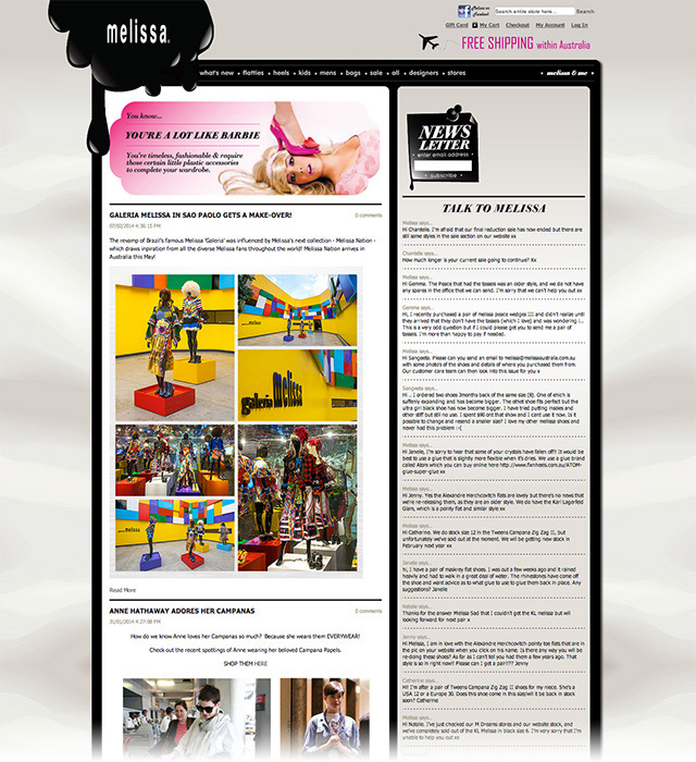 Melissa Australia provides access to all the fun things that happen in the land of Melissa. This includes the launch of new season ranges, information about upcoming events, access to special offers and discounts and information about where Melissa is in the world, what she is doing, who her friends are and how you can be part of it.
